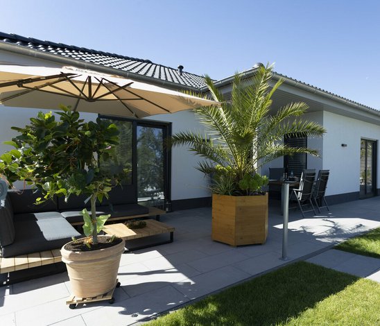 Das neue Leben im Winkelbungalow 108 bezeichnet der Hausbesitzer als „6er im Lotto“. Das sei einfach eine ganz andere Lebensqualität – auch, weil alles schon fertig war, als er im April 2019 einziehen konnte. Und das Beste daran, was ihm niemand so richtig glauben will: „Der Preis, der mir am Anfang genannt wurde, war zu hoch. Am Ende hatte ich sogar noch 20.000 Euro übrig. Davon habe ich dann die Garage und den Pool bauen lassen.“ Eine Kalkulation – auf den Cent genau!